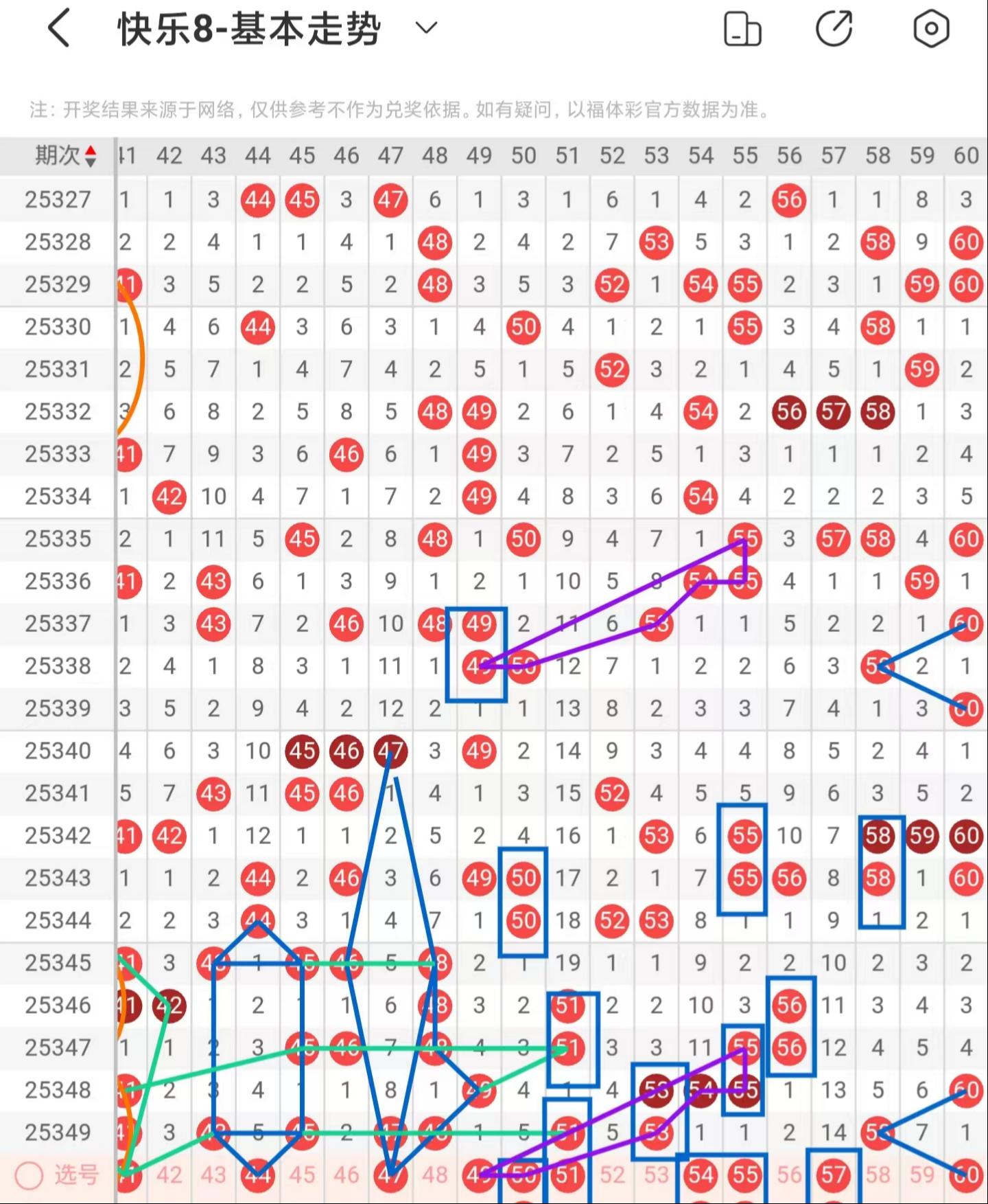 三区间上期小面积增加落号,一共开出八个号码球,本期考虑减少号码球的数量,注意斜连走势构成平行四边形形态的41号码球,注意百期相似形态的44号码球,注意近期45、46、48号码球的走势相似,本期注意41、49号码球,注意期数和值加减法的46号码球,防守菱形形态的47号码球,同时也是近期斜连走势回补号码球,阶梯落位重码走势注意50、51、54、55、57号码球,注意近期53、54、55号码球的走势相似,本期注意49、50号码球,注意近期58、60号码球反复回补,注意防守60号码球,因此三区间关注41-44-46-50-55,注意本区间的选二复式41-46-50。