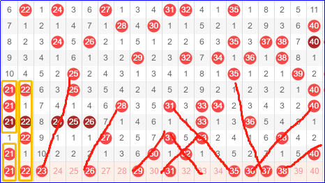 第二区间号码21-40,二区号码依然不给力,斜连号在本区基本失效,走出的全部是邻号。不过30 40两个号码是直播间今天提到的号码,就是不知道有没有人去做。尤其是22不给力,没有延续21的走势继续出现,这是一个判断失误。所以接下来的走势尽量避开斜连号的走势,想做的可以按照防守去做。