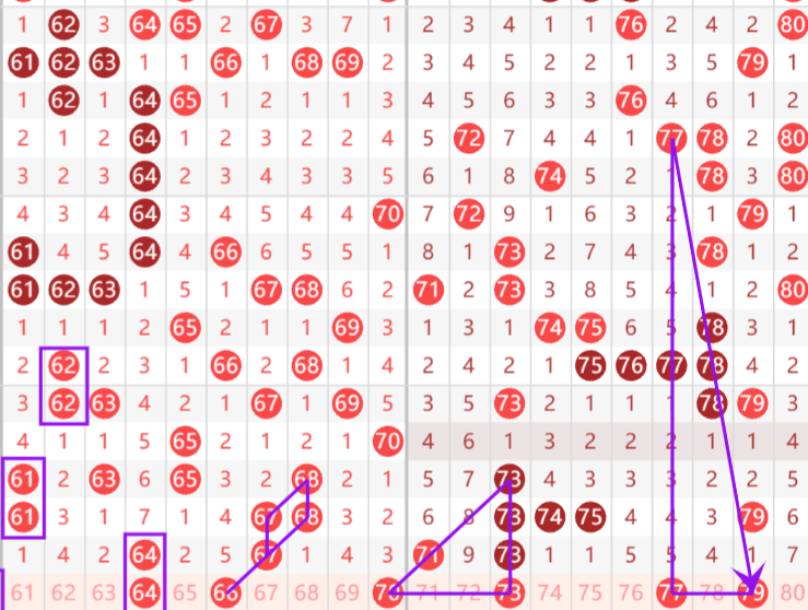 上期四区间开出64 67 71 73四个号码,四区间整体热度下滑,本期四区间热度持平,预计开出号码五个,本期四区间重点号码推荐,重号重点推荐64 73,邻号重点关注70 66,孤号重点推荐77 79;