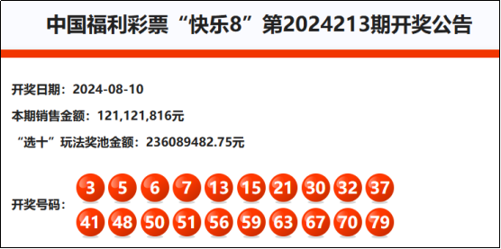 首先我们先来回顾快乐8第2024213期开奖号码:
