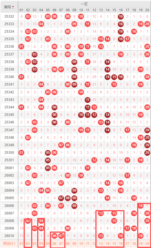 一区:最近一区10期出号情况为:4 4 4 5 5 5 5 4 5 5,总出号情况为46个,平均出号4.6个,本期一区号码推荐出号为:02 04 06 07 13 14 15 16 19 20。重点关注:06 13 15 16 19。