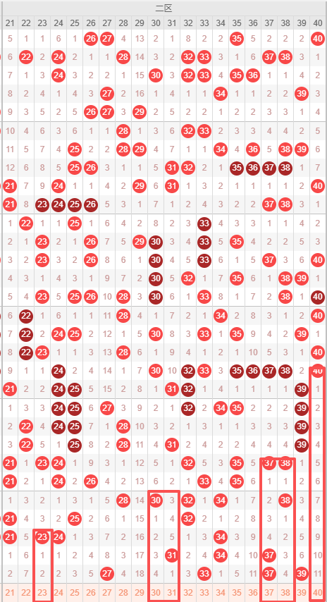 二区:最近二区10期出号情况为:7 5 5 7 5 5 3 4 3 4,总出号情况为48个,平均出号4.8个,本期二区号码推荐:23 30 31 37 38 40。重点关注:30 31 37 40。