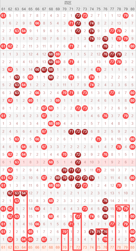 四区:最近四区10期出号情况为:5 10 6 3 3 7 7 5 7 6,总出号情况为59个,平均出号5.9个,本期四区号码推荐:63 64 70 72 75 76 78 79,重点关注:63 64 70 75 79。