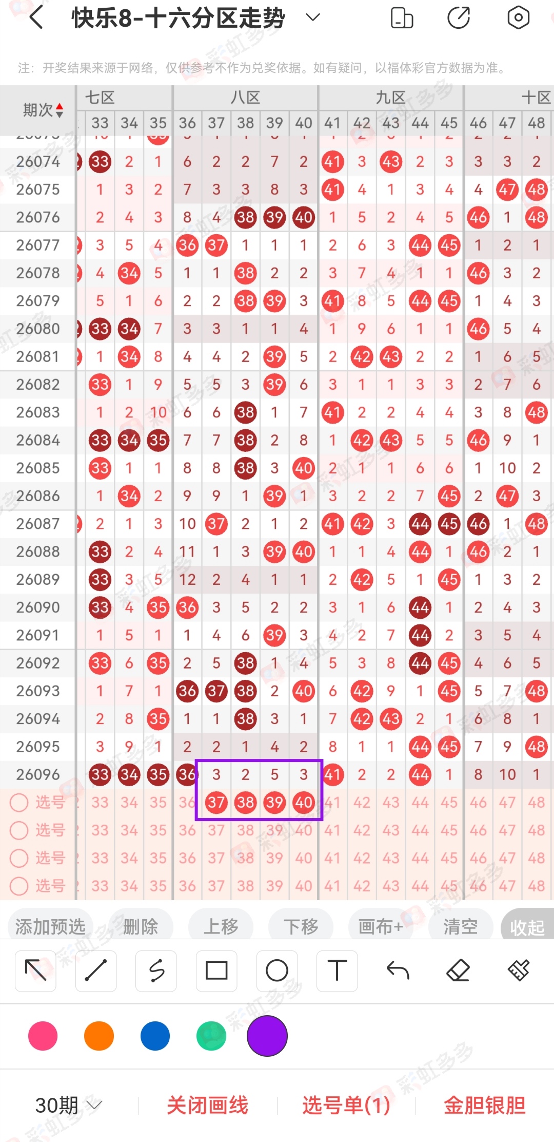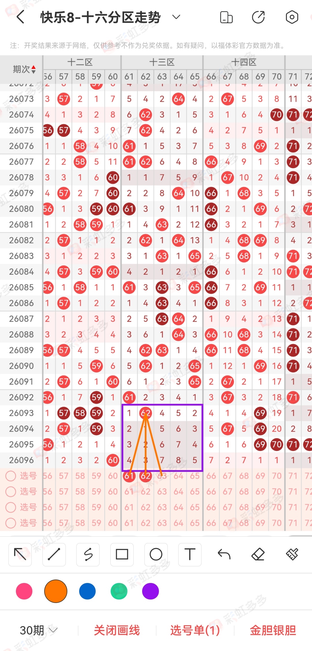 第二地方说一下变动的空区理解,我们30期内出现8次2期空区,空区的基本归纳是号码存在顺位,但是那一天48出现了变化。然后比方说昨天的6头61-65以及76-80已经出现2期空区,然后又出现了3期空区。参考了其他地方的3期空区,基本路数大差不差,相同点还是存在顺位,所以空区前是62,那么今天大概率61 63出1码,当然理想的状态是同出61 62 63,历史数据存在过。像后面的80如果顺位有且仅有1码79。像这样的类型,很大程度上就是坑,不建议去碰。这里只是基本猜想,如果存在继续空区,比方说今天的76-80再来一次空区也是可以的,这种类型在尾图里面出现的多。其实大家看号的方式差不多,变化的就是关联组合问题。点位都能够发现一些。