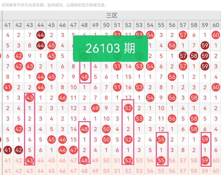 上期第三区间开奖个4号码,本期可能会增加开出。43紧贴三区起步区间,上期41、42开出后,相邻小号极易走连带出,属于惯性跟进号;48长期维持隔2–5期开出的节奏,出号周期稳定,本期考虑这个号码会开出;52弥补三区中段长期空白,近多期中区号码缺失严重,而且近期这个号码开出次数较少,存在回补现象;55目前遗漏1期,但是上期开出的时候是遗漏12期后,所以这个号码偏冷,近期会有开出现象;59为三区高位边界号,靠近60节点,上期三区间大号偏少,59可以有效弥补缺失的问题。