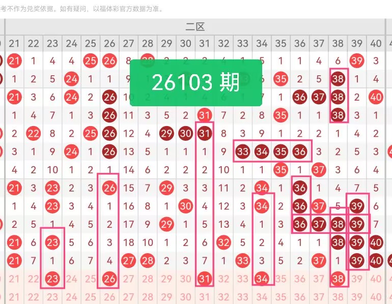 上期第二区间开奖7个号码,本期可能会减少开出。23属于二区前段温号,近5期开出3次,走势较为平稳;26走势周期稳定,同时这个号码是极冷号27和28的邻号,间隔出号规律明显,稳定性极强;31处在二区中心点位,目前遗漏7期,前后号码断层大,本期考虑这个号码会回补开出;34为偶数,在走势图上呈现斜三连号的形式,本期大有机会会开出;38是二区高位收尾号,靠近40临界点,上期末尾号码密集,高位邻号有轮换开出机会。