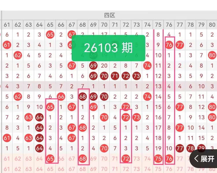 上期第四区间开奖5个号码,本期可能会稳定开出。65是四区前端冷号后区末尾大热之后,前端冷号会迎来回暖轮换;68偶数目前遗漏2期,衔接四区前段走势,间隔2期可以形成对称走势;72遗漏3期,上期70-77无号码开出,这个72正好弥补中间空白的情况;75、76贴近上期热号77–79,属于近距离邻号轮换,相邻号码容易接力出号,而且这两个号码较冷,有回补开出的机会。