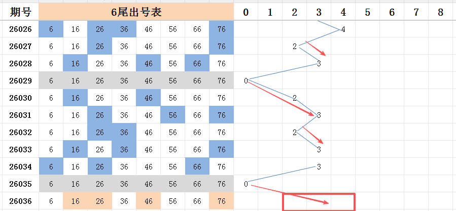 本期看好开出的范围是两码走势至四码走势之间。六尾上期是断尾的走势,本期看好的号码中,号码26是遗漏1期的号码,两个遗漏2期的号码16.76,看好能开出其中一个。八个号码中,遗漏期数最大的号码是46,走势也比较不错,看好能够开出。