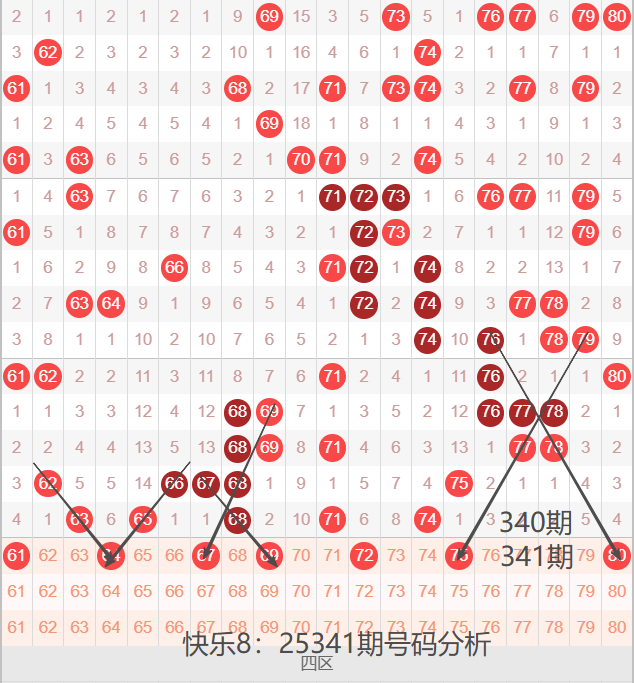 上期该区间开出号码:63 65 68 71 74,5个号码球,区间呈现温热开,四区间整体来说太不稳定,该区间也是经常冷一下,热一下,前端和后端也是经常拉扯,双方经常交替落码,选号时,还是谨慎一些比较稳妥,本期个人四区间预选号码:61 64 67 69 72 75 80,61号是遗漏4期的号码,64号是双线斜连的夹角的位置,遗漏6期的号码,67号是遗漏1期的号码,69号是遗漏2期的号码,三斜连落位走势,72号是遗漏6期的号码,75号是遗漏1期的号码,均线三斜连落位走势,80号是遗漏4期的号码,也是均线三斜连落位走势,通过以上分析,四区间终选号码:61 64 67 72 80 。