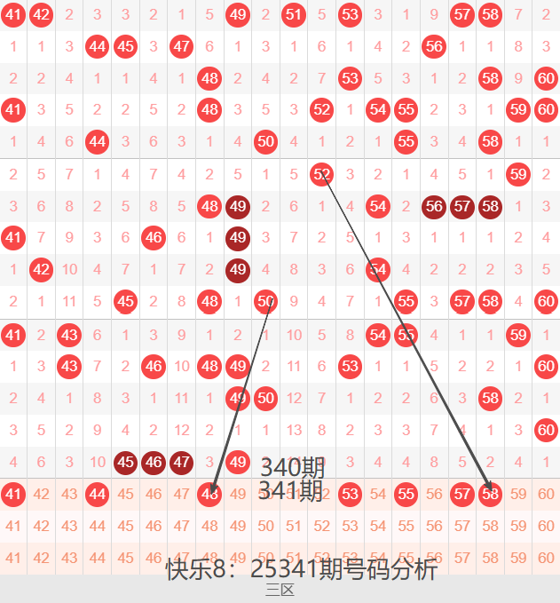 上期该区间开出号码:45 46 47 49 ,4个号码球,区间呈现温冷开,区间整体上目前是在热开的周期,号码出号近期也比较平均,分布相对与其他大区间来说很均衡,本期二区间个人预选号码:41 44 48 53 55 57 58,41号是遗漏4期的号码,44号是遗漏10期的号码,48号是遗漏3期的号码,均线三斜连落位点,53号是遗漏3期的号码,55号是遗漏间隔对称状态,57号是遗漏间隔5-2-5的对称号码,58号是遗漏间隔2期的对称号码,均线三斜连落位走势,通过以上分析,三区间终选号码:41 44 48 53 58 。