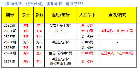 上期杀10码对8,免费文章杀5码对4,金胆命中,4胆全拖命中2胆,选五复式3注命中3码,重号3码命中1码。