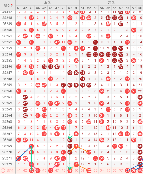 五区开出:43,47,50 奇偶比: 2:1 和值:140 跨度:7,上期开出3个号码,奇数号码占优势。本期三斜连走势:44 46,无隔码斜连走势。近10期平均出2.9枚,本期推荐关注号码:43、44、49。