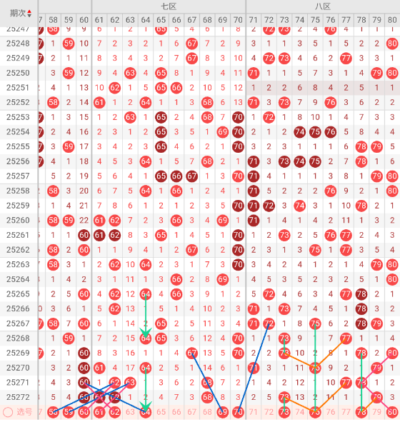 八区开出:73,79 奇偶比: 2:0 和值:152 跨度:6,上期开出2个号码,奇数号码占优势。本期三斜连走势:80,无隔码斜连走势。近10期平均出号2.6枚,推荐关注号码:73、75、78、80。