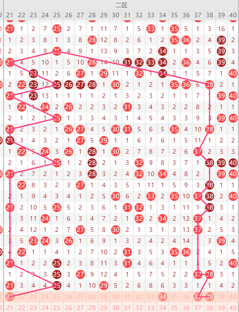 第二区间的走势分析:第二区间上期开出了3个号码球,属于前半区3个,属于后半区断码的走势,根据二区间的走势规律,今天的二区间我们主看后半区38的回补,走出了上下对称的走势形态,再看二区间前区位置21-25这两个个号码球的落位,重点关注34-37-38组合