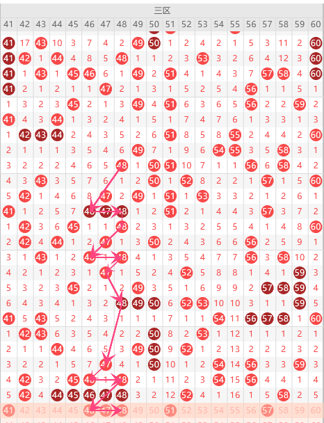 第三区间的走势分析:第三区间上期开出了8个号码球,主要的落号点位在三区间的前半区,走出了2奇4偶的形态走势,上期三区间的前半区落下了6个号码球,后半区落下了2个号码球,整个三区间处于走热的趋势,根据三区间的走势规律,今天的三区间我们主看前半区龙头位置41-48组合的落位,48属于热码的走势,48走出了连期对称的走势,重点关注46-47-48组合这个号码球的落位。