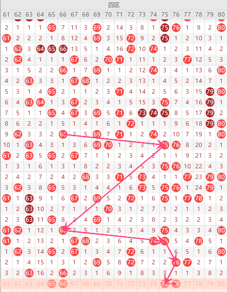 第四区间(61-80)第四区间的走势分析:第四区间上期开出了2个号码球,主要的落号点位在四区间的前半区,走出了1奇1偶的形态走势,上期四区间的前半区落下了2个号码球,整个四区间处于偏冷的趋势,根据四区间的走势规律,今天的四区间我们主看后半区66这个号码球的落位,根据以往66的落球规律。重点关注75-76组合