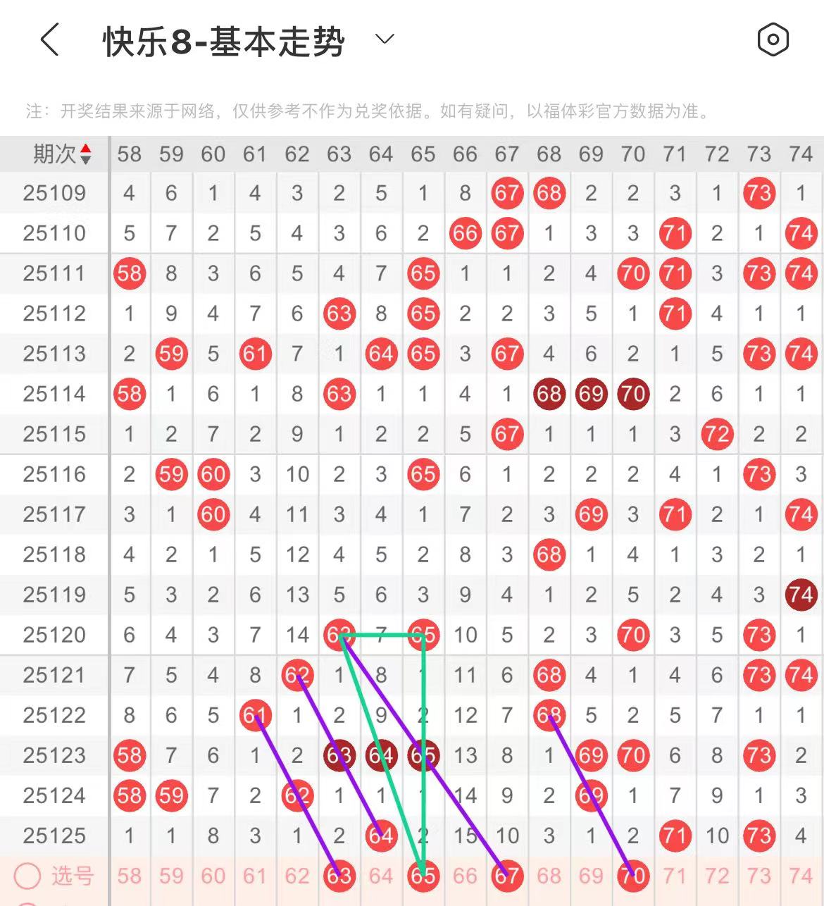 61-70区:本区间上期开出了一个号码,从号码走势图上看,该区现属于温热区,本期号码走势简单明了,出号个数有增加的可能。本期有出号走势的号码有63号,平行斜连出号走势,65号,形成一个三角走势形态,67.70号,均有斜连出号走势。