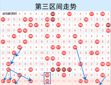 该区间的41号已经追了3期了,本期在追一下,不出就放弃了。上期开出44号,本期他的邻号43 45我们就要注意了,大可能会出一码的。该区间的49号我们要防守一下出现重号的情况。56号时属于遗漏10期的号码,本期遗漏10期的号码有2个,我们可以选一个做号的。