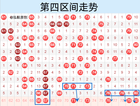 该区间的66 67上期错过了,做了67 68,不知道本期还有没有补救的机会,我们在来一次吧。上期的连号空一带号70 71 73号没能落号下来,本期应该是要回一个号码了,我们要做好防守。上期开出的3连空一出号76 78 80号,本期我们要注意一下出现一重和一夹号的可能了。
