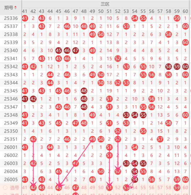 而三区的打底号是42.43.45.47.49.50.52.53.58.59中参考3-4码开出机会,