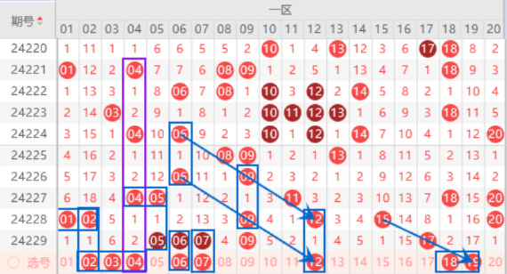 该区间的01 02号数字和04 05号数字形成了阶梯形态,上期开出了05号数字,那么本期的01 02号数字我们就要注意落下一个号码的情况,本期的01号数字是属于161走势,02号数字是属于空一的斜连号码,都有出号机会,我们关注一下02号数字,防守一下01号数字的出号情况。上期开出了三连号05 06 07号数字,本期我们要注意出一个重号的情况,上期开出了号码05 07 09 17号数字,这些数字中是要有重号开出来的,所以本期的05 07出一个重号的机会是比较大的。