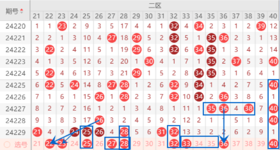 上期开出了三连号24 25 26号数字,本期这里也是有机会出一个重号的,本期的26号数字出三重的机会不是很大,24号数字出重的机会也不是很大,所以本期的25号数字我们可以关注一下出重的情况。连号空一带号35 36 38号数字已经遗漏2期没有出现回补了,本期回补一个号码的情况是很大的,38号数字本期不看好出号,所以本期的35 36号数字我们可以重点关注一下出一个号码的情况。