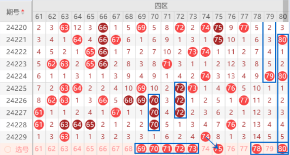 该区间的69 70 71 72 73号数字是属于重号的边号回补号码,本期是有机会出1-2个号码,我们要重点关注一下,尤其是其中的71 72 73出一个号码的概率比较大,本期的71号数字是属于遗漏6期的号码有5个,出一个是没有问题的,所以71号数字是有机会的,72号数字是属于三斜连号码,73号数字是属于324的乱序走势号码,这里我们重点关注一下72 73号数字的出号情况,防守一下71号数字的出号情况就行了。