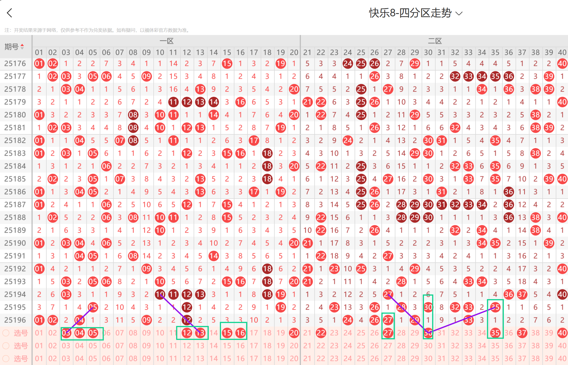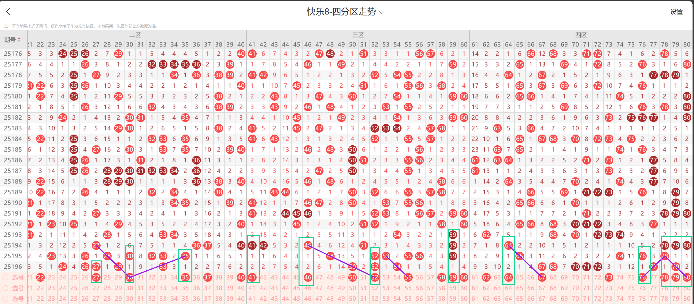 第2025197期福彩快乐8通过以下走势图及一二区间预测分析如下: