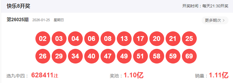 快乐8第2026025期开奖号: