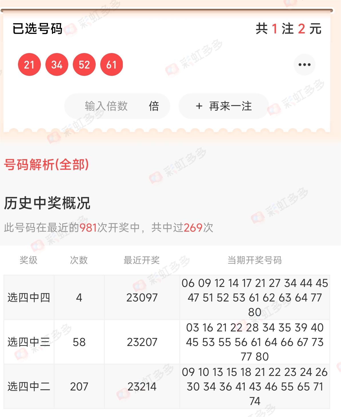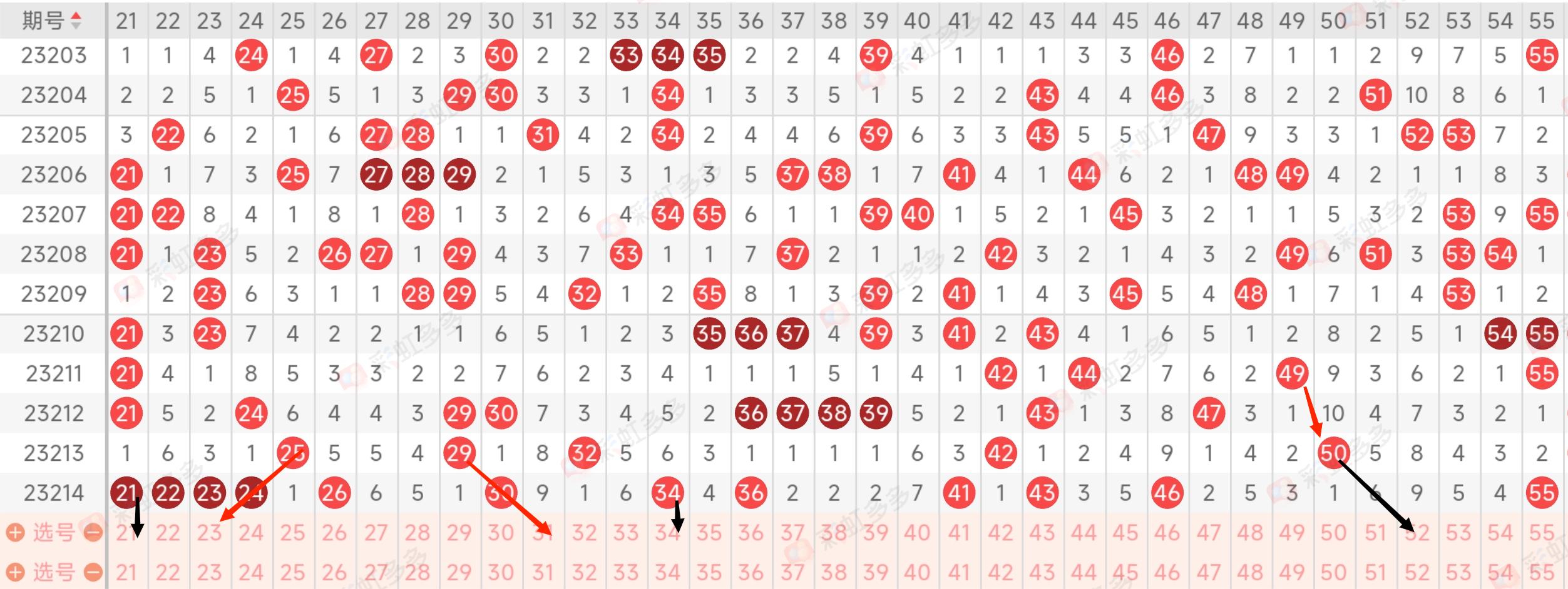 四码:  21 34 52 64,这组4码球在近981期开奖:中4个号码球次数仅为4次,本期可以关注,有可能会回补开出,近期在23097期命中4个号码球!