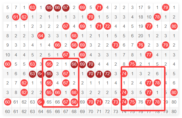 • 区间分布分析:将1-80个号码划分为不同区间(如4区每区20个号,或8区每区10个号),观察各区的出号冷热。如果某个区间连续多期过热,下一期可能会降温;反之,持续冷清的区间则有回补的可能。