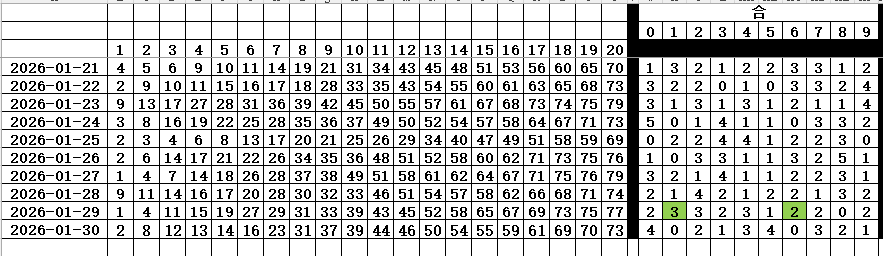 上期没有开出合1(1,10,29,38,47,56,65,74) ,合6(6,15,24,33,42,51,60,79) 上期合1合6总数为5个 本期考虑3-4个 合下面有参照表