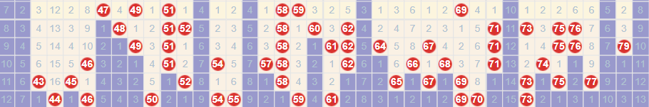 近100期接近或超过最大遗漏值号码为:5,10,24,41,53,56,63,72,78,80  合1合6为10,24,56