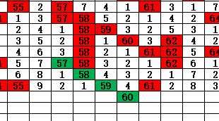 上期遗漏值尾分别为3,4,1,4,1,1,0,0,2,0,6,1,5,1,6,4,2,0,8,0 可见少了7和9遗漏值尾 那么本期遗漏值尾位7和9的号码为5,42,53,56,与合1合6结合42,56号球可以看一下