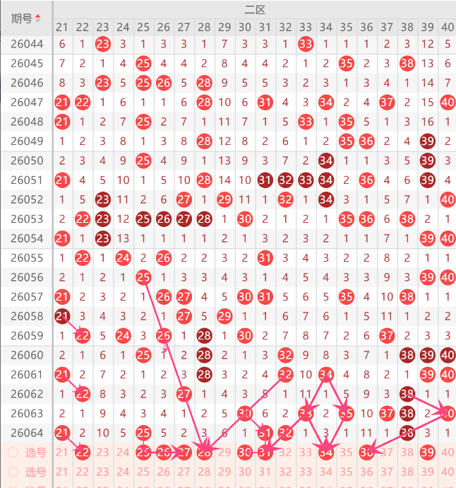 二区间注意打底号22.23.25.27.29.30.31.34.36.39.40中关注3-4码开出机会,