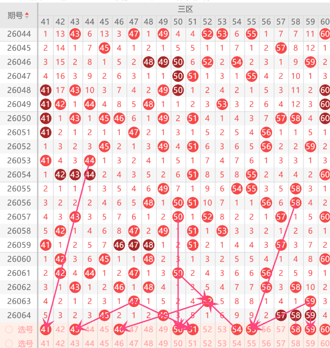 而三区的打底号是41.42.43.44.46.48.50.51.54.55.57.中参考3-4码开出机会,
