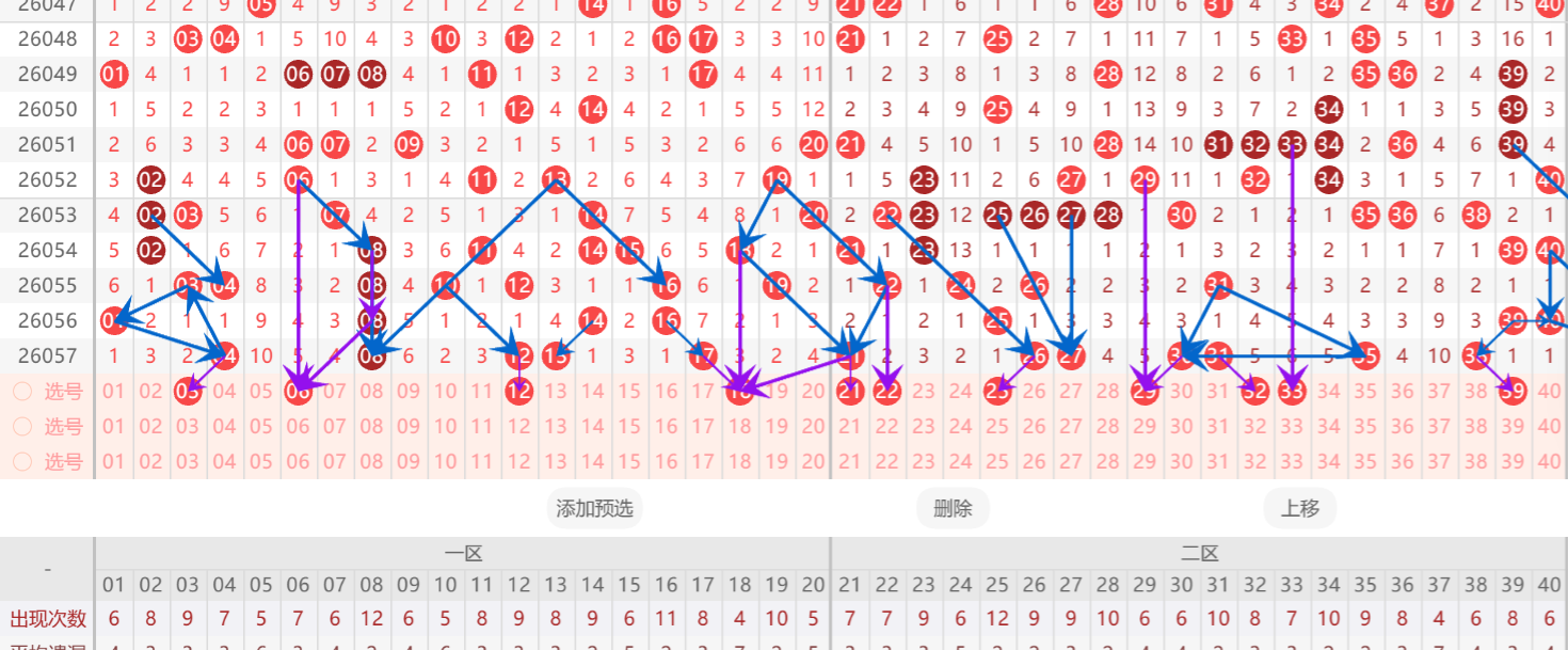 第二:判断第一区间热度会有所上升,注意一些奇数偶数搭配的联动号码,需关注斜连形态的号码。