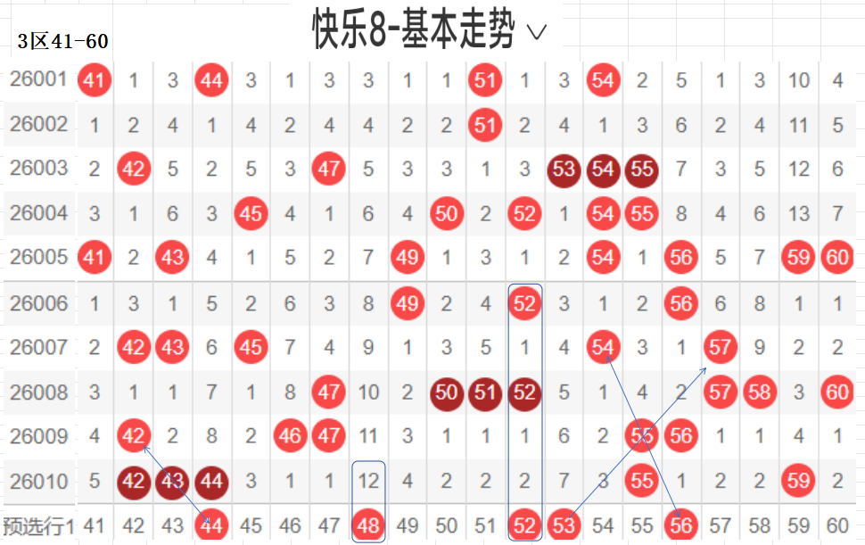 三区(41-60):遗漏5期以下有18码,0码42 43 44 55 59 5个,温开方式,这区码数有回暖之意,可以防一手,先定胆码走势较大者,隔期,斜三连,分边号码,可重防,间隔5期以上号码可以随走势选取,例如本期大冷码,走势比较大,可以做胆,通常联动可带出,分边对称的号码,本区间也有很大走势.可关注下.隐形夹角号码.做补位形态号码.都需要观察动态走势.以上是本区间的选码方法.