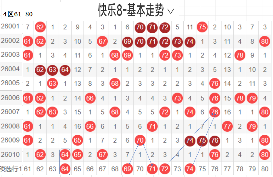 四区:(61-80):遗漏5期(含5)以下有19码,0码62 64 65 67 76 80 6个,平均温开方式,上期开出7码,区间回暖,后区可防,四区间从以往数据来看,重码很强,一枝独秀的存在,近期有回补走热的趋势,区间回暖后,本区间后区可防,与一区相比,也是温区.,对称下落码,隔期回补码,可以防守,这区对呈对称三角关系的胆码,斜三连有走势的胆码,联动落位码,都有各自的走向落位关系,根据走势选择一种方式选码.