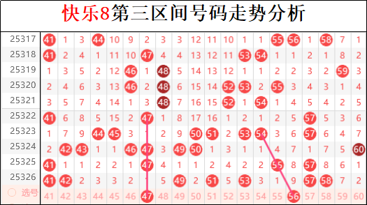 三区上一期热度再回,这也是三区惯用的招数,冷转热玩的明明白白。上个一期连码重号分边等差数列尽数开出。形态中只缺少斜连的走势,所以本期布局上面对两队三角杀的走势应该会有号码下拉,只是选择上要注意。三区斜连走势的缺失恰为本期埋下伏笔,或可关注42-44与51-53区间内的斜连补位可能。同时留意45与54的对称呼应,或成为破局关键点。近期三区冷号轮动明显,46、48、50等号码已显露回补迹象,尤其50作为边缘重号具备联动爆发潜力。重点关注41与59的两头联动,防范三区再次出现跨段斜连走势。