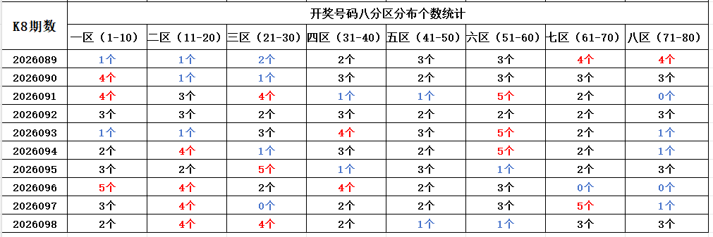 首先看上期回顾,“快乐8”第26098期开奖结果:6.7.15.17.18.19.21.23.26.29.34.36.49.52.65.67.69.72.77.80通过分析开奖号码,分享第一个数据分析:统计开奖号码的八分区冷热走势,判断出号规律。以近10期开奖号码的八分区统计数据为例: