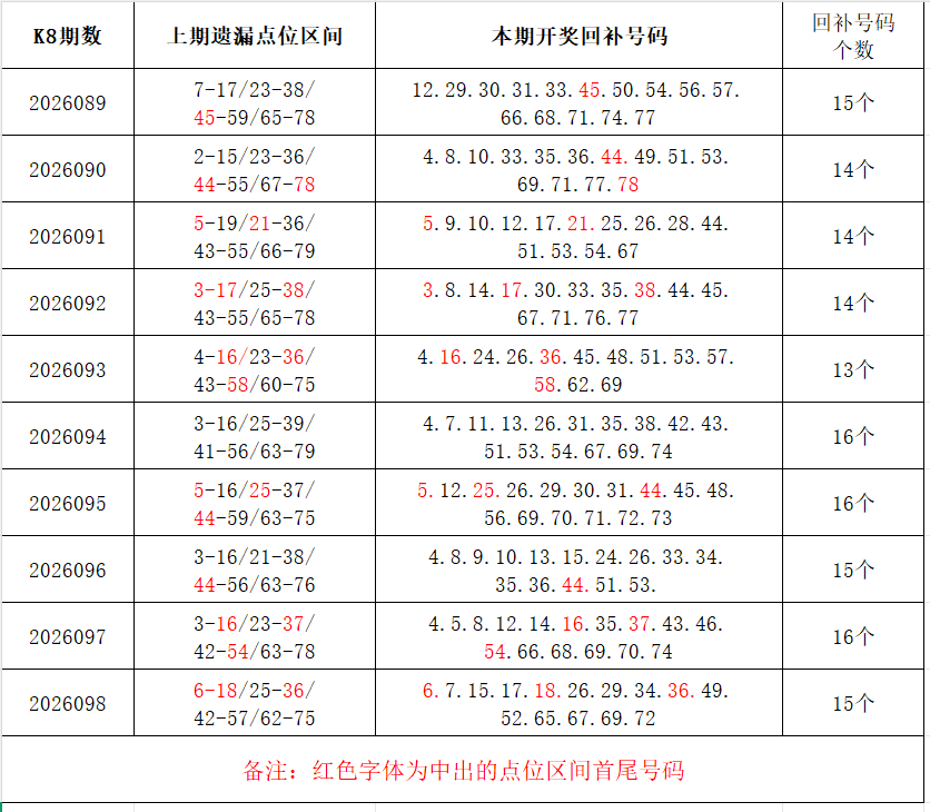 如图,上期的遗漏号码在下期开出10个左右,即为回补号码。定准点位区间首尾号码是关键!以上期2026098期为例,定位4个遗漏区间,围中15码!结合上期开奖号码,以跨度值大于或等于7为依据,本期关注3个遗漏区间:7-15/36-49/52-65;重点关注遗漏区间:5-16/22-35/43-58/66-76。点位区间号码和大底号码请勿混淆,个人分析,仅供参考。