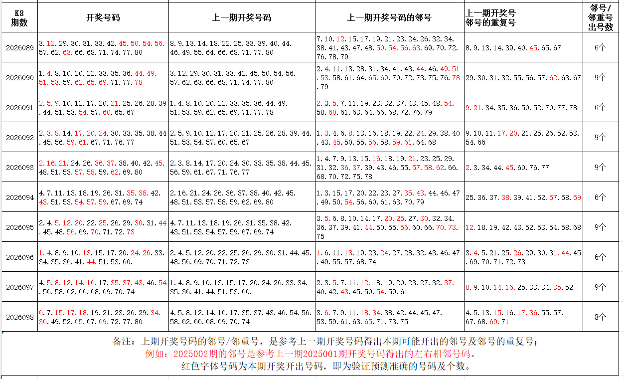 如图,红色字体是上期邻号、邻重号在下期开出,每期开出10个左右。上期邻号开出4个,邻重号开出4个本期参考邻号:5.8.14.24.25.27.28.30.33.37.48.50.51.53.64.70.71.73.76.78.79邻重号:6.7.16.17.18.19.20.22.35.66.68;个人分析,仅供参考。