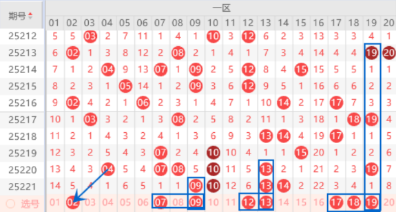 该区间02号数字我们注意一下出号情况,本期可以防守一下01 02号数字同出的情况。上期开出了09 10 13 14号数字,本期我们注意出一个重号的情况,其中的09 13号数字我们关注一下,本期可以防守一下07 09号数字同出的情况,本期的12 13号数字我们也是可以防守一下同出的情况。本期的19号数字是属于4321的走势,本期是有机会出号的,我们可以防守一下18 19号数字或者17 19号数字同出的情况。