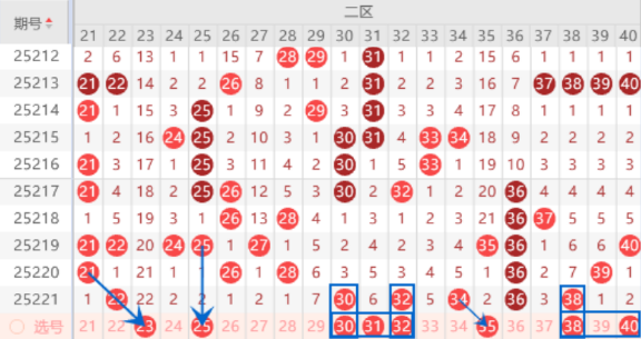 该区间的23号数字是属于遗漏22期的号码,本期有两个,所以本期是有机会出一个号码,本期的23号数字我们可以关注一下出号情况。本期的25 26号数字是属于交叉对称号码,本期是有机会出一个号码的,其中的25号数字我们可以重点关注一下出号情况。上期开出了30 32 34 36 38号数字,本期的40号数字我们注意一下出号情况,毕竟偶数就40号数字没出了,当然该区间的重号我们也是注意出号的,其中的30 38号数字可以重点关注一下,夹号关注一下31 35号数字就行了。