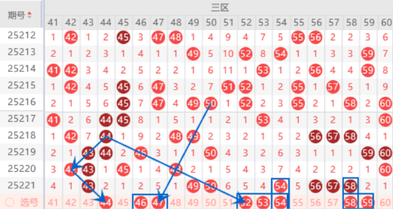 该区间的44 46号数字是属于交叉对称号码,本期也是有机会出一个号码的,我们可以重点关注一下。本期的47号数字是属于四斜连号码,出号机会也是有的,我们可以防守一下46 47号数字同出的情况。本期的52号数字是属于五斜连号码,出号机会也是有的,我们可以防守一下52 56号数字同出的情况。上期开出了56 57 58号数字,本期我们注意一下出一个重号的情况,其中的58号数字我们可以关注一下出号情况。