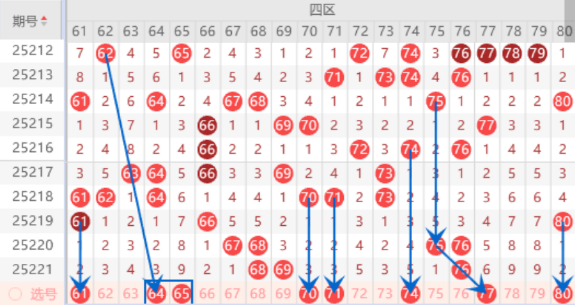 该区间的59 61号数字是属于交叉对称回补号码,本期出一个号码的机会是有的,本期我们可以重点关注一下。本期的65号数字我们防守一下出号情况,本期可以防守一下64 65号数字同出的情况。连号空一带号70 71 73号数字断号三期了,本期我们注意出一个号码的情况,其中的70 71号数字我们可以重点关注一下出号情况。本期的72号数字也是有出号机会的,我们可以关注一下出号情况,本期可以防守一下72 74号数字同出的情况。