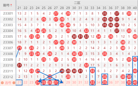 连号23 24号数字的落号情况,本期我们做一下防守就行了,本期有可能会断号。上期开出了26号数字,本期我们要注意走重的情况,防守一下25 26或者26 27号数字同出的可能。本期的33号数字我们要注意一下冷号回补的情况。上期开出了连号空一带号38 39 41号数字,这里我们注意出夹号40号数字的情况,如果40号数字不出那么本期就有机会出39 41的重号了,这里我们要注意一下。