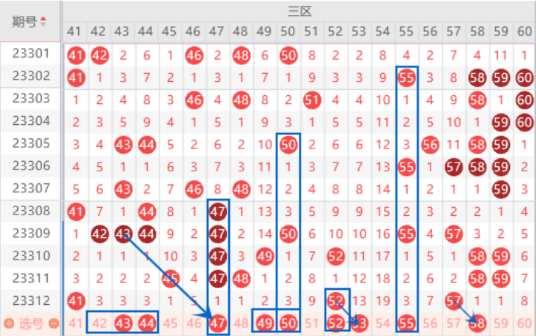 三连号42 43 44本期我们要注意落号情况,本期落下一个号码的机会是很大的,我们要注意了。连号空一带号45 47 48上期没能出重号,本期我们要防守一下回补号码的情况,重点防守一下47号数字的出号情况就可以了。本期的49 50号数字我们要注意同出的情况,可以防守一下。本期的52号数字我们要防守一下出重的可能,如果本期的41号数字不出重,那么52号数字出重的机会就很大了。