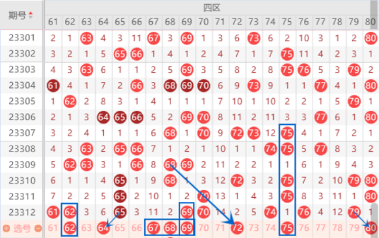 上期开出了连号61 62号数字,本期我们注意一下61 62号数字出一个重号的情况。本期的64号数字我们防守一下,走势是很好,但是遗漏6期的号码只有2个,本期就不一定出号了。本期的67号数字我们可以关注一下,三冷号斜连,出号机会还是有的。上期开出了69 79号数字,本期我们要注意出一个重号的情况。本期的72 75号数字我们也是要注意的,同出的机会还是有的。本期的80号数字我们关注一下,出号机会还是有的。